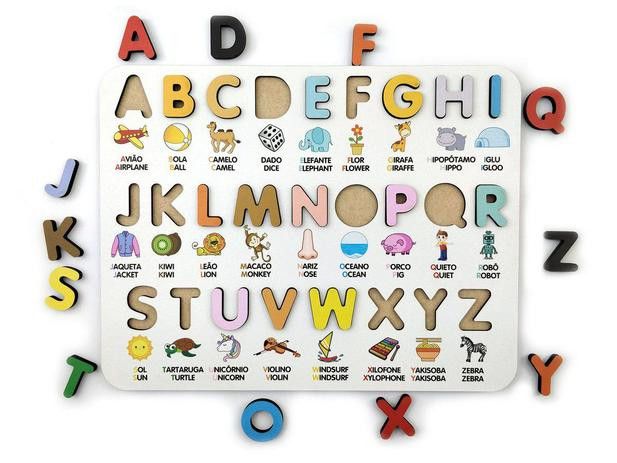Alfabeto BILÍNGUE Ilustrado Pedagógico 3D- Brinquedo Educativo Montessoriano em madeira - Quebra-cabeça Encaixe