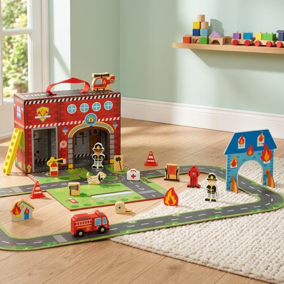Com 35 peças, a criança cria histórias de resgate, desenvolve criatividade e aprende de forma lúdica conceitos básicos sobre segurança e prevenção de incêndios, enquanto fortalece habilidades motoras e sociais.