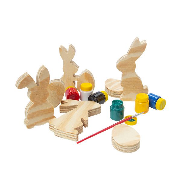 Conjunto no tema páscoa. São 7 peças em madeira de reflorestamento, 6 cores de tinta atóxica e pincel para colorir. Além de pintar os personagens e objetos, basta soltar a imaginação para criar uma história, o cenário e a interação entre os bonecos!